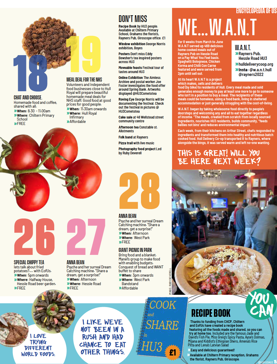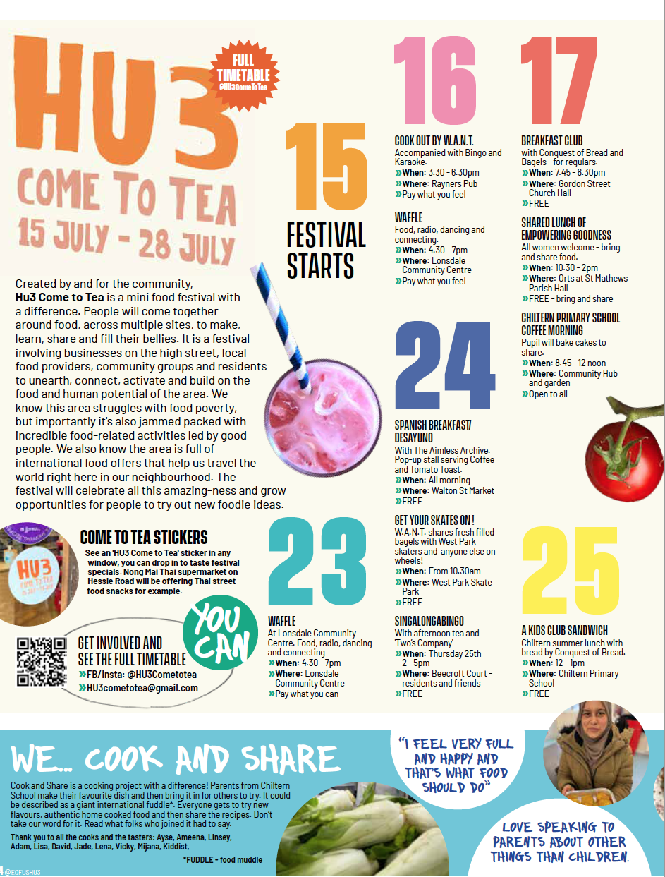 In an area more typically dealing with food poverty Come to Tea galvanises the incredibly international population around the unifying potential of food and raise awareness of what HU3 offers. It brings people together at picnics, exhibitions, breakfast clubs, chippy tea’s… in pubs, shops, cafes, churches, street… to experience food and food stories made in the area by locals, businesses and groups.